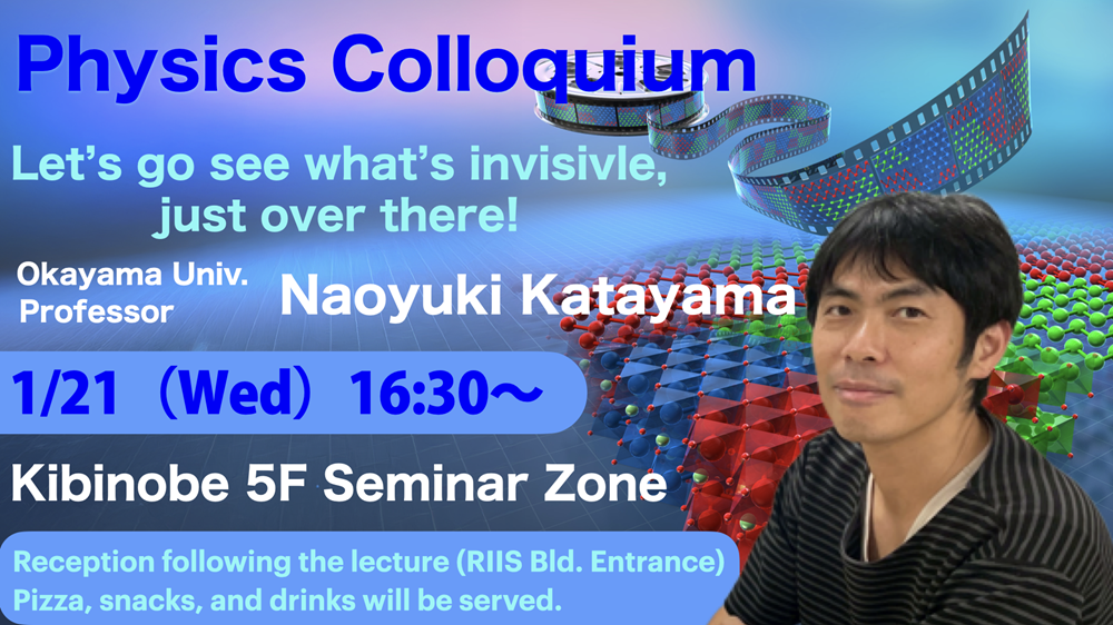ビザ、お菓子、ドリンクを用意してみんなで物理談義で盛り上がりましょう。 After the lecture, we will move to the entrance hall of the RIIS Bld. for a casual reception. |
